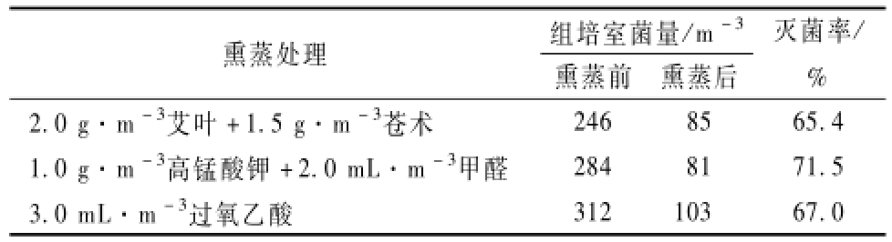 由表1可知,艾葉用量為4.0 g.m-3時,滅菌率高,為60.8%~68.4%;用量為1.0 g.m-3時,滅菌率低,為43.2%~63.9%。結果顯示,艾葉對黴菌的滅殺效果優於細菌。隨著艾葉用量的增加,兩者間的差異降低。艾葉用量為1.0 g.m-3時,對黴菌的滅殺率與對細菌的滅殺率間的差異大,為20.7百分點。因此艾葉用量2.0 g.m-3進行熏蒸是工廠化生產較優且經濟的選擇。