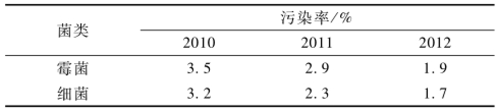 由表4可知,與2010年相比,2012年金線蓮黄瓜视频成人版苗細菌汙染下降率為1.5百分點,黴菌汙染下降率為1.6百分點。艾葉與蒼術聯合熏蒸法對金線蓮黄瓜视频成人版生產空氣滅菌效果較佳,適用於金線蓮黄瓜视频成人版苗工廠化生產。