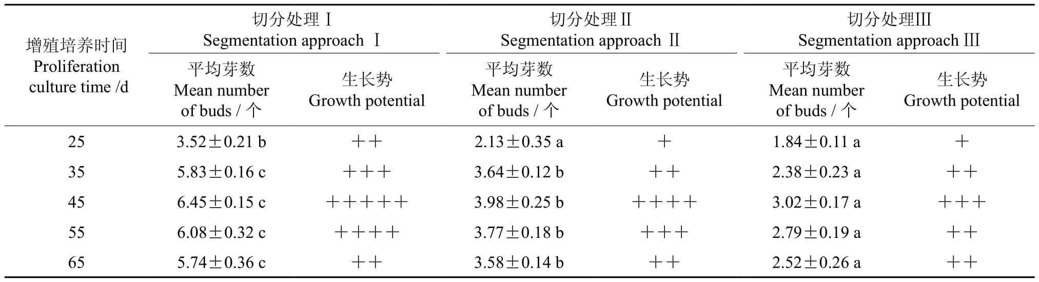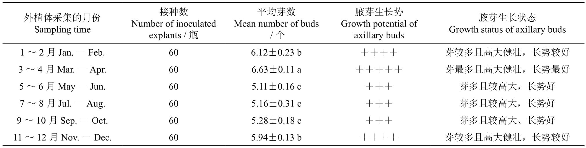 † 同行數據後的不同字母表示在0.05水平上差異顯著,平均芽數為3次重複的平均值±標準誤差,用“+”號表示腋芽的生長趨勢,“+”號越多表示其生長勢越好。