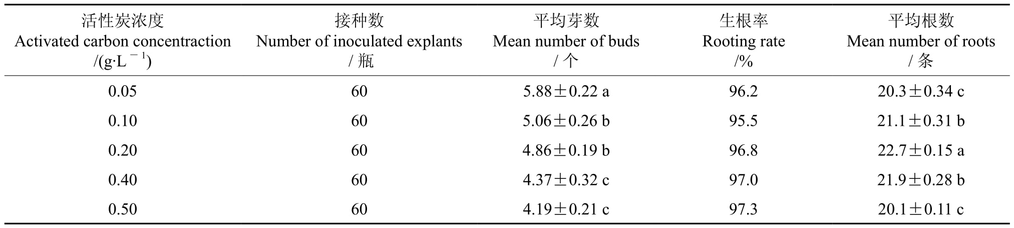 表4 含有不同濃度活性炭的培養基對多花黃精黄瓜视频成人版苗增殖和生根的影響