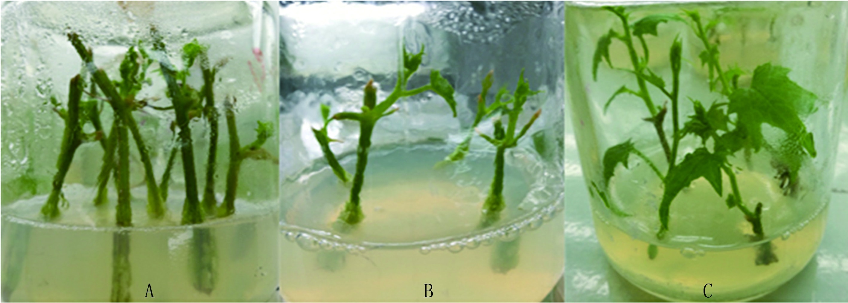 待初代培養基中腋芽長至4~5節帶葉莖蔓後,將帶葉莖蔓剪成一葉莖段,去掉葉子後接種到繼代培養基中,每瓶接種5~8個莖蔓。觀察不同繼代培養基配方處理的莖蔓生長情況。