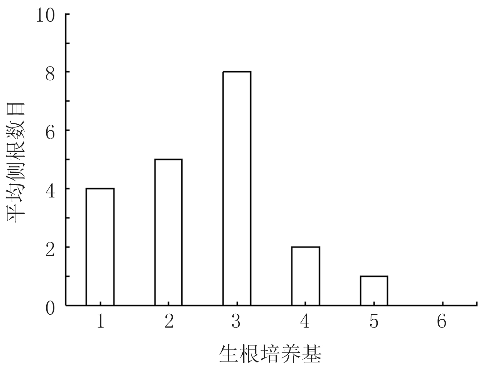待繼代培養苗長至6~8節後,將莖段剪下接種到生根培養基中,每瓶接種2~4個,誘導生根。觀察不同生根培養基配方處理莖段的生根情況並測量根直徑、平均側根數目。