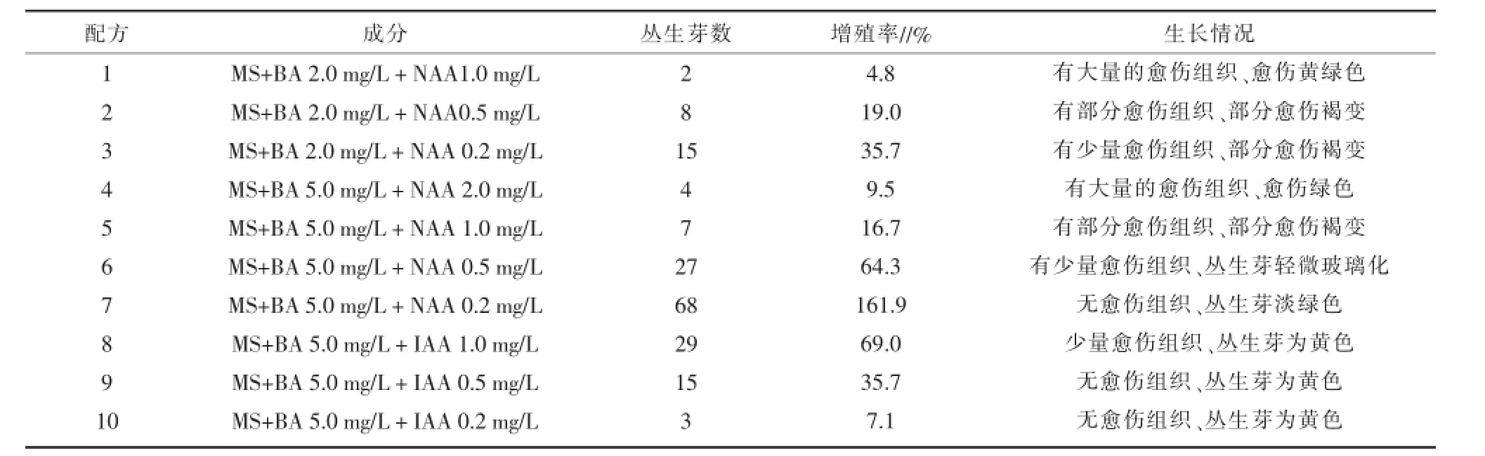 叢生芽誘導和壯苗培養的條件為培養基中含蔗糖3%,瓊脂0.7%,pH 5.6~6. 0;培養溫度25~28℃,光照時間14 h/d,光照度2 000~2 500 lx。