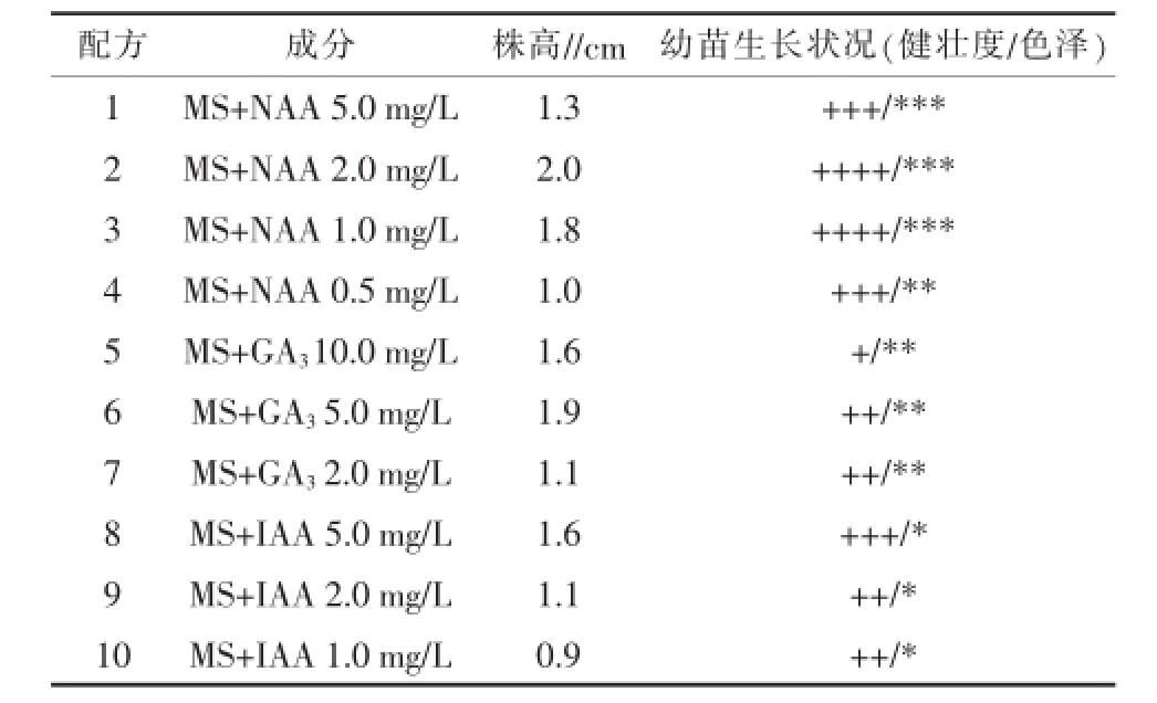不同壯苗培養基下幼苗生長狀況有所不同(表3)。配方2、配方3、配方5、配方6和配方8幼苗高度較高,分別為2.0、1.8、1.6、1.9和1.6 cm,其中配方2的幼苗高度高,其次是配方6和配方3。配方2和配方3幼苗生長健壯、色澤深綠色;配方5和配方6幼苗生長細弱或一般,色澤淡綠色;配方8幼苗較健壯、色澤黃綠色。為了促使幼苗的快速茁壯生長,適宜空氣鳳梨黄瓜视频成人版的壯苗培養基配方為MS+NAA(1.0~2.0 mg/L)。