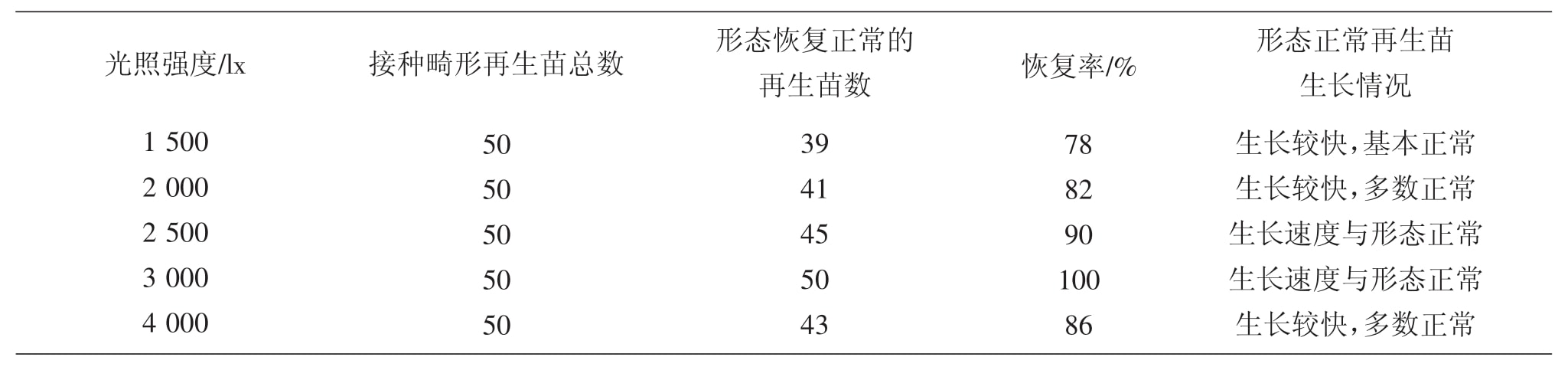 從表2可以看出,冰燈玉露形態正常率較高,原因主要是由於試驗采用的培養基為MS附加0.25 mg·L-1的BA,因此,黄瓜视频成人版苗形態普遍變得較為正常;但在不同溫度下,形態正常苗的比例有所不同,當溫度為20℃時,獲得的形態正常的黄瓜视频成人版苗數多,而隨著溫度的增加,黄瓜视频成人版苗恢複率也逐漸下降,到28℃時,僅有38%。說明冰燈玉露形態建成培養的溫度應采用較低的溫度。在試驗中,也曾采用18℃進行培養,但結果顯示,幾乎所有黄瓜视频成人版苗都停止生長,隻有個別生長正常,說明過低溫度也不利於冰燈玉露黄瓜视频成人版苗的形態建成。雖然在20℃時可以獲得較高的冰燈玉露黄瓜视频成人版苗的恢複率,但也因溫度較低,黄瓜视频成人版苗生長速度較慢,也不是理想的培養條件。為此,試驗又采用不同光照強度來提高形態重建率,希望獲得較高、較快的冰燈玉露形態重建培養。