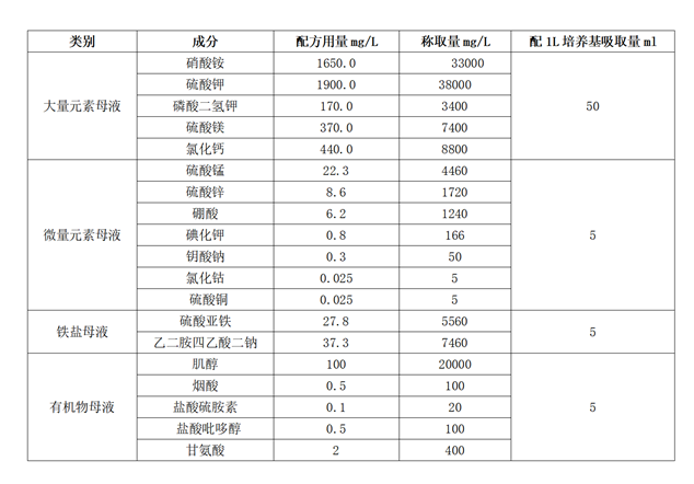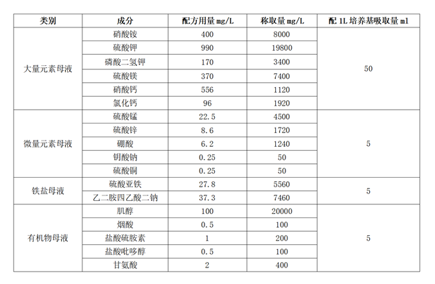 WPM基本培養基母液配製見表