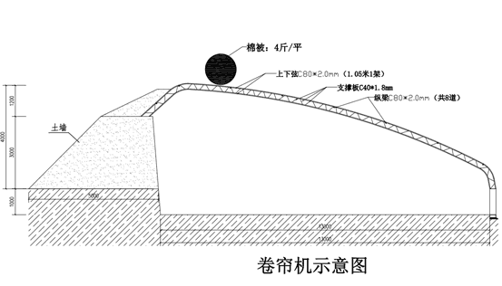 這種大棚跨度4一12米,肩高l一1.8米,脊高2.5—3.2 米,長度20—60米,拱架間距0.5—1米,縱向用縱拉杆(管)連接固定成整體。可用卷膜機卷膜通風、保溫幕保溫、 遮陽幕遮陽和降溫。
