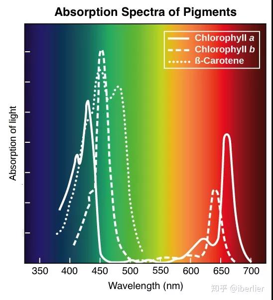 兩種葉綠素(葉綠素a和葉綠素b)的吸收光譜相似,但也有所差異:首先葉綠素a在紅光部分的吸收帶寬些,在藍紫光部分窄些,而葉綠素b在紅光部分的吸收帶窄些,在藍紫光部分寬些;其次,與葉綠素b比較,葉綠素a在紅光部分的吸收帶偏向長波方向,而在藍紫光部分則偏向短波方向。胡蘿卜素和葉黃素的吸收光譜與葉綠素不同,他們的很大吸收帶在藍紫光部分,不吸收紅光等長波的光。因此要想植物的光合作用正常進行,光譜就必須滿足光合色素的吸收波段。