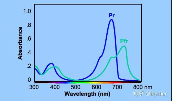 光敏色素分為紅光吸收型(Pr)和遠紅光吸收型(Pfr)兩種類型。兩者的光學特性不同,Pr的吸收高峰在660nm,Pfr的吸收高峰在730nm。Pr和Pfr在不同光譜作用下可以相互轉換。當Pr吸收660nm紅光後,就轉變為Pfr,而Pfr吸收730nm遠紅光後,會逆轉為Pr。