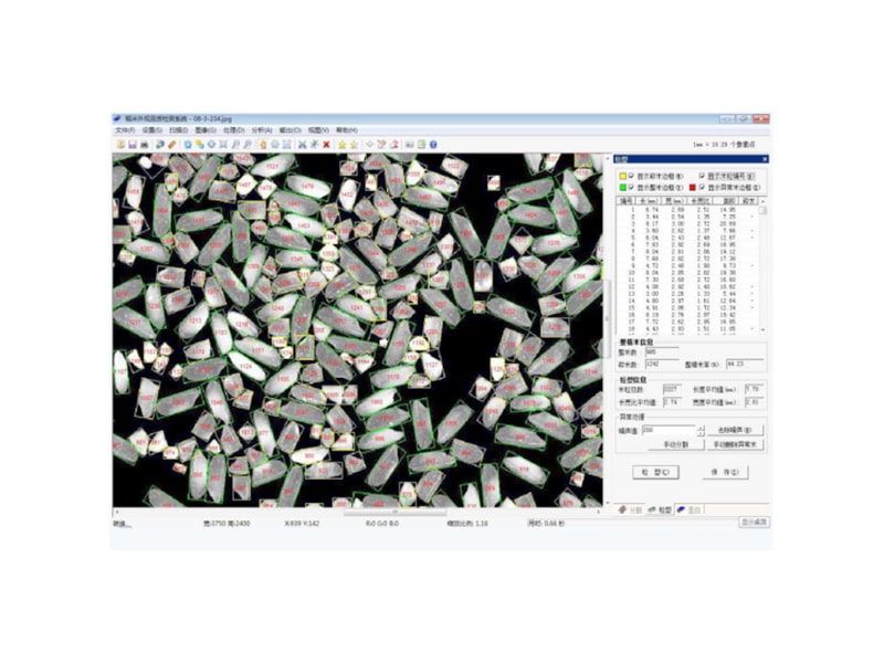 1.軟件可自動計算出粒型的指標,主要包括每個米粒的長、寬、長寬 比、麵積和碎米標記;米粒總數,米粒長、寬和長寬比的平均值;米粒的整米數、碎米數、整精米率;